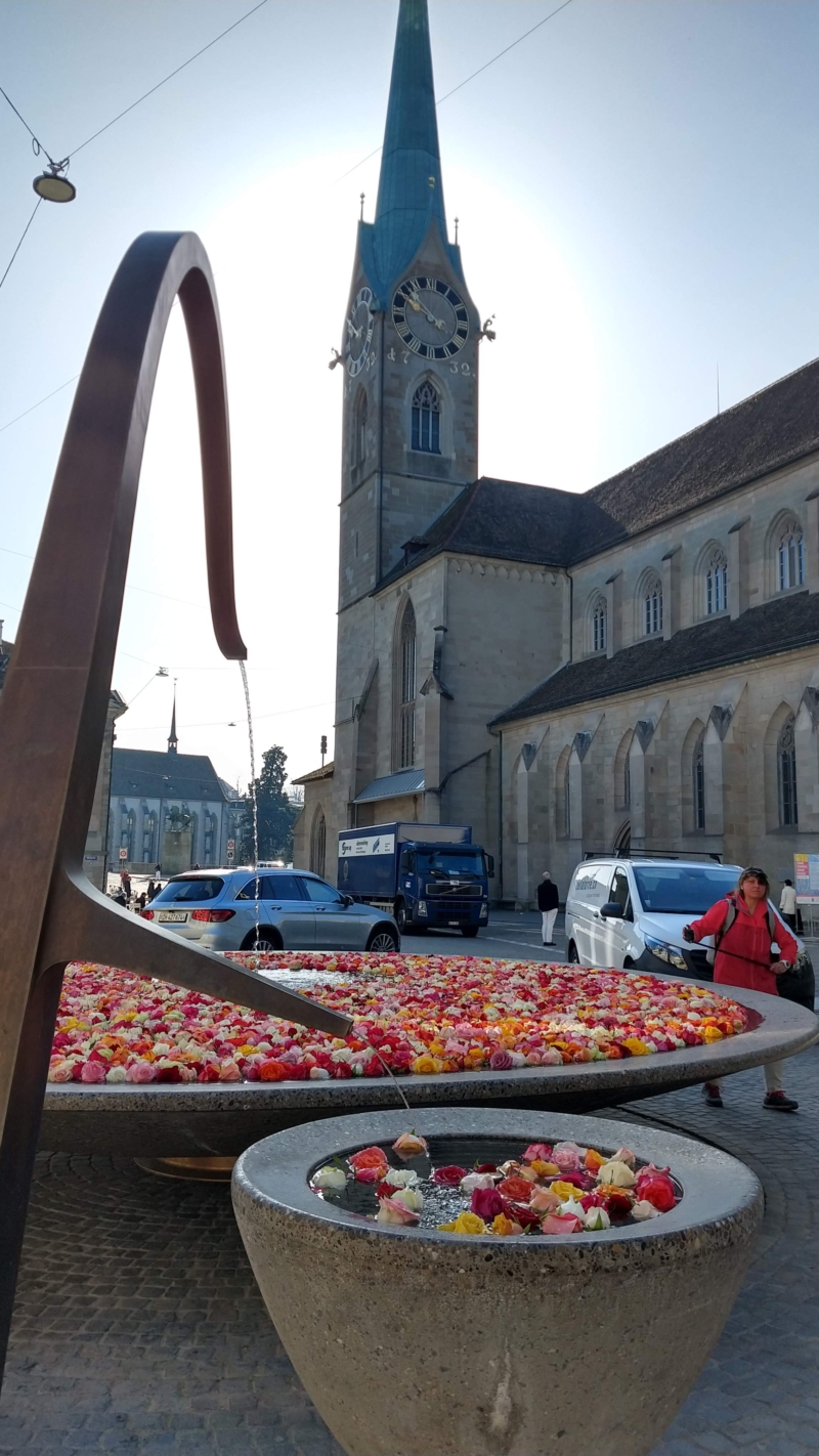 チューリッヒ市内の7つの噴水がカラフルなバラの花で埋め尽くされています。